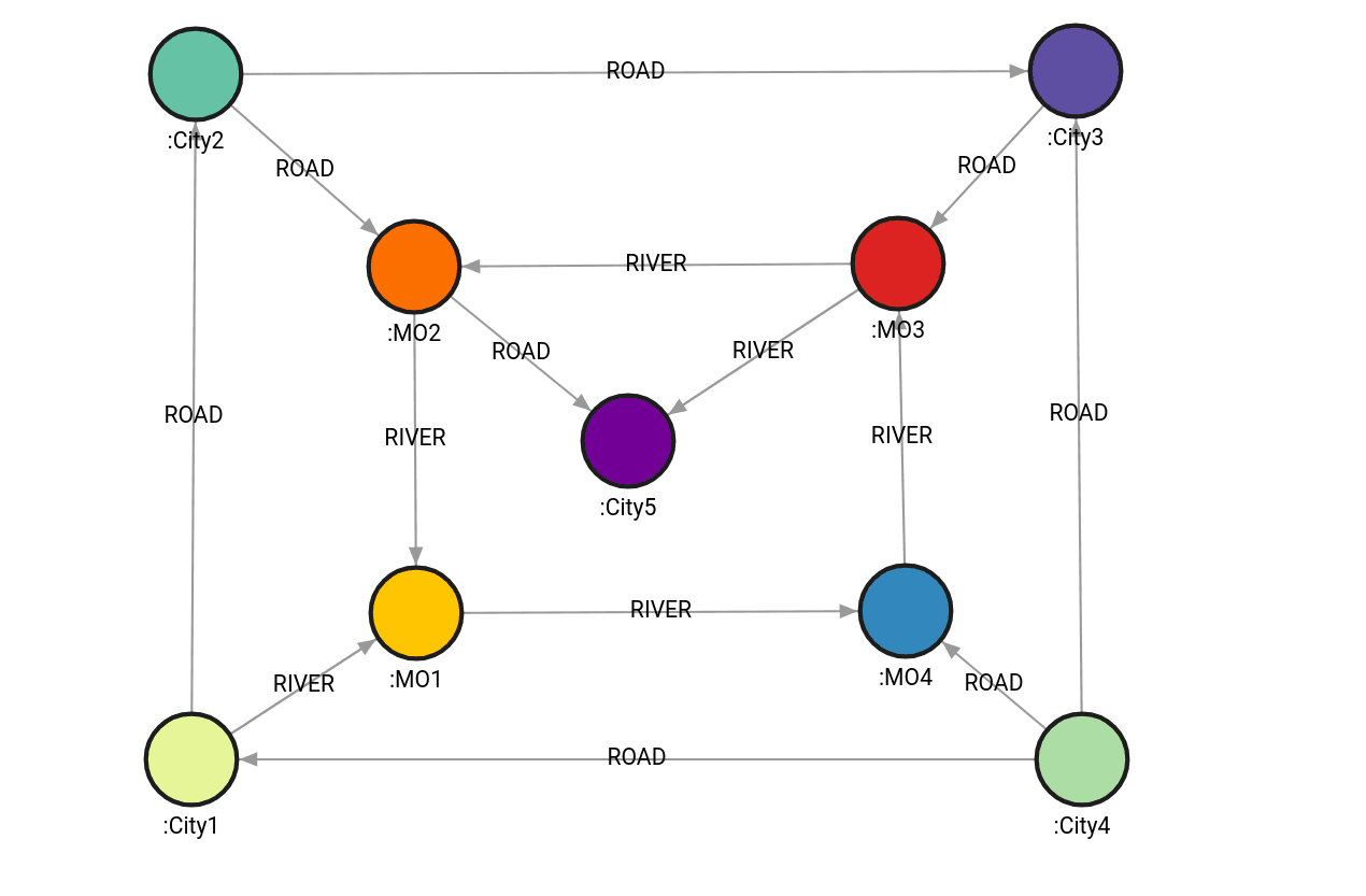 The nodes are connected with ROAD and RIVER type of relationships. Each relationship has a defined distance property.