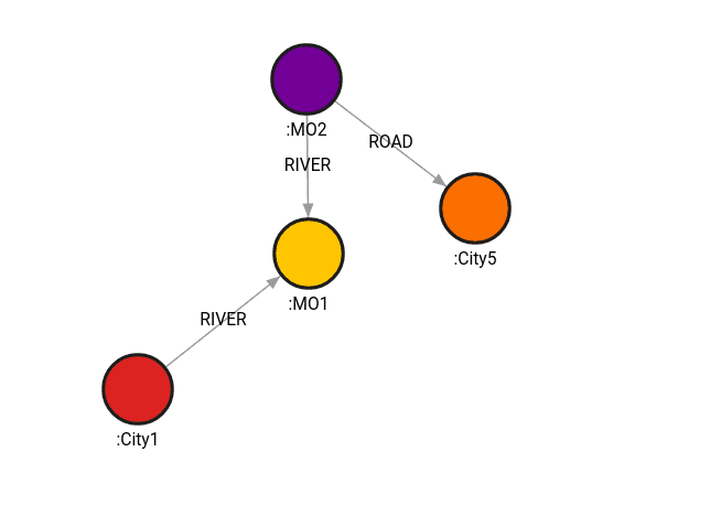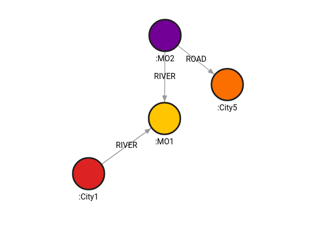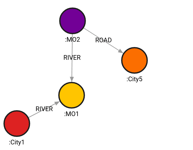 Use the following queries to create a graph with five City nodes, and four MO nodes. Each node has a defined latitude and longitude properties.