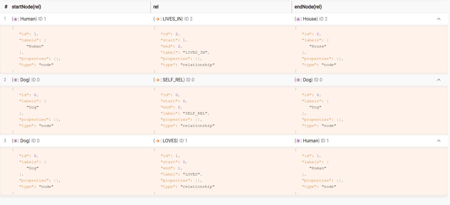 rel: Relationship➡ A separate record is created for each relationship between nodes, and a relationship is returned.