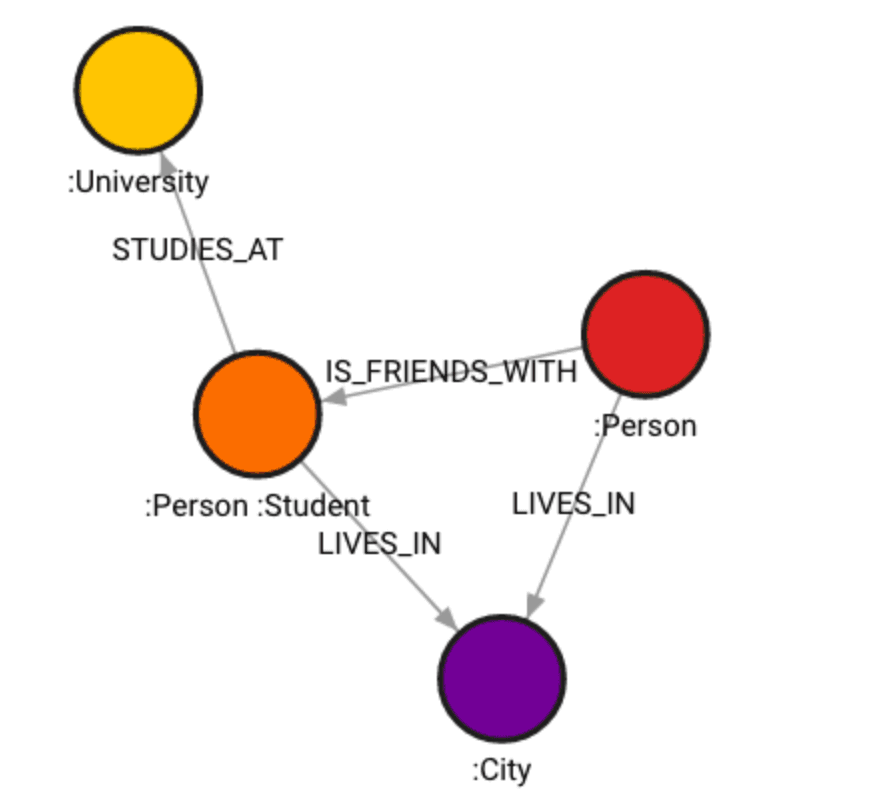 CREATE (n:Person {name: "Kate", age: 27})-[:IS_FRIENDS_WITH]->(m:Person:Student {name: "James", age: 30, year: "second"})-[:STUDIES_AT]->(:University {name: "University of Vienna"})