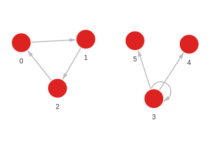 The first analysis that is most often run on a graph is usually a search for disconnected components. The algorithm implemented within this module does exactly that, it searches for different components of the graph. Within components, nodes have connections toward each other, while between components there is no edge that connects nodes from separate components.