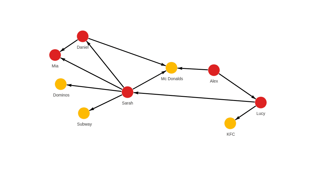 MATCH (u:Person), (v:Restaurant) WHERE u.id = "101" AND v.id = "200" CREATE (u)-[:ATE_AT {liked: true}]->(v);The first five queries create nodes for people, and the following four queries create nodes for restaurants. The rest of the queries are used to define relationships between nodes. As said before, you can define different types of nodes and relationships in one file.