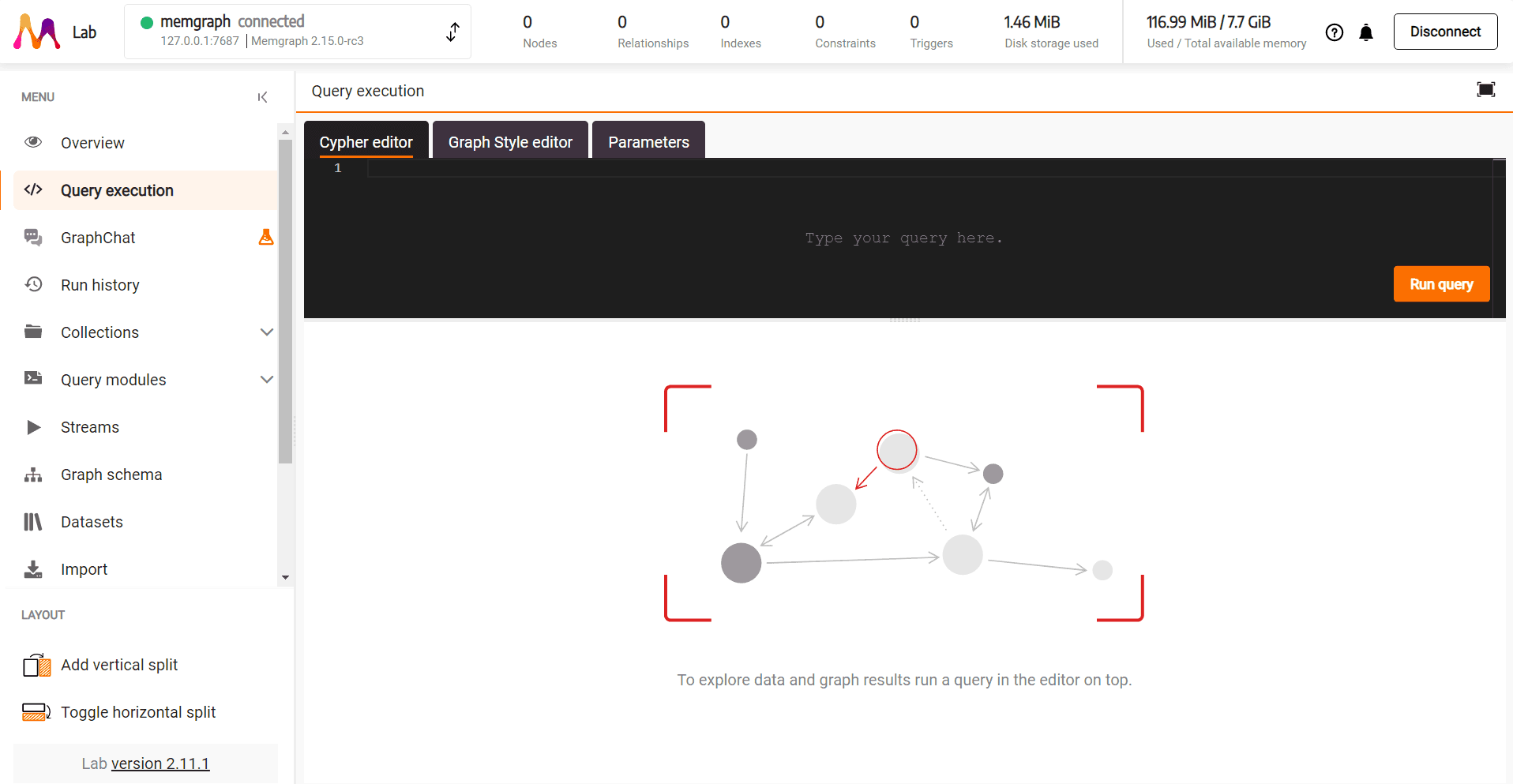 Place yourself in the Query Execution section where you can execute queries in the Cypher editor to import data into Memgraph.