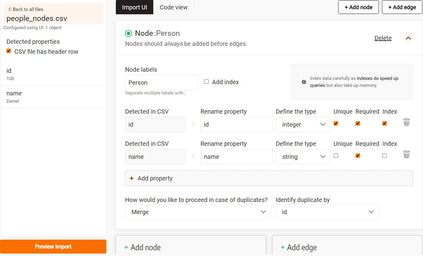 After clicking on the + Add edge button for our CSV file with a header,
