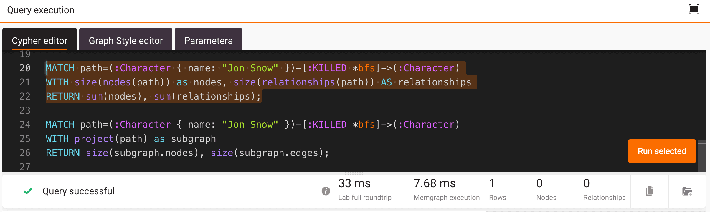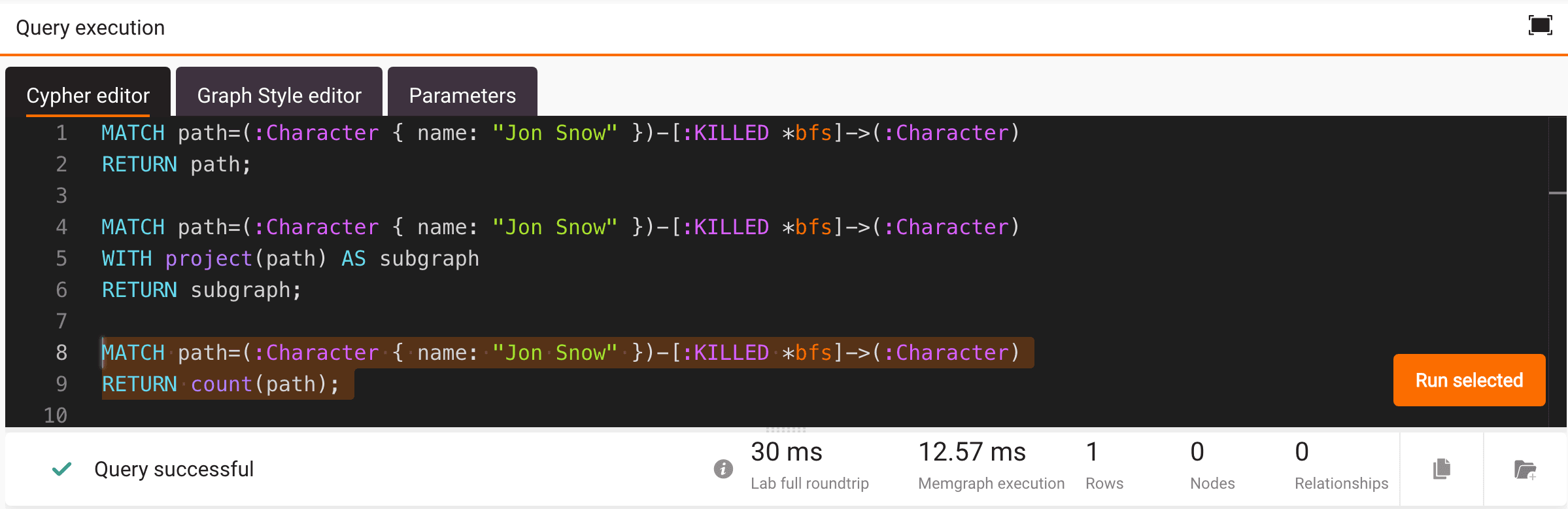 RETURN path;This way, Memgraph eliminates traversing through unnecessary relationships, shortening the execution time.
